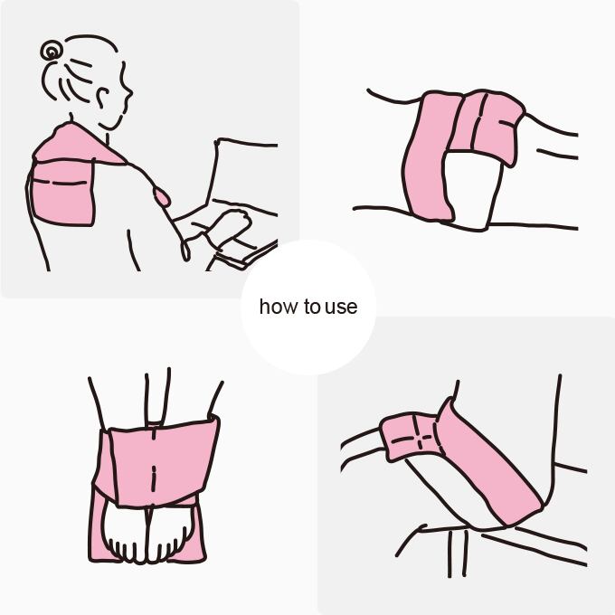 * 椅子などに座っていることが多いので、お腹・足の付根(鼠径部)・ふともも にのせておくと圧迫されている場所がじんわり温まって気持ちいいです。